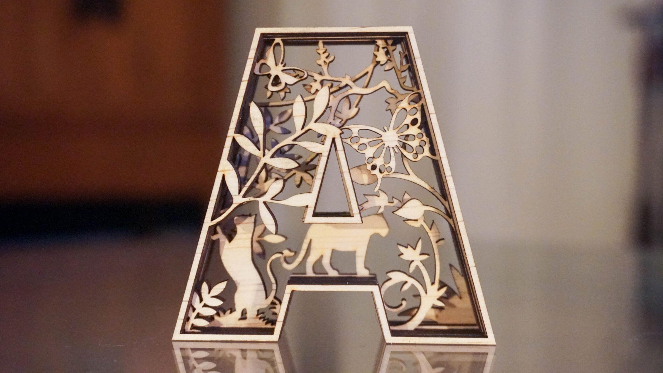 Meerlaagse houten letter A met katten, vlinders en planten. Handgemaakt en vol speelse natuur.
