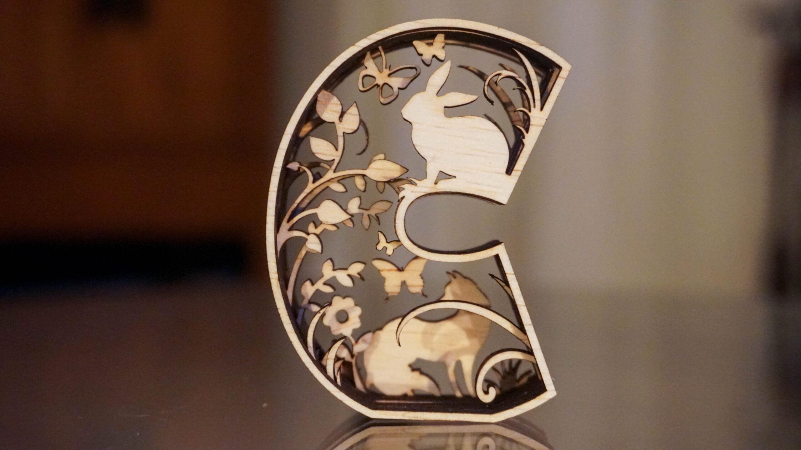 De botanische houten letter C voelt als een stille bosochtend. Bovenop de boog zit een konijntje tussen de bladeren, terwijl onderaan een vos staat – rustig, alsof hij even stilhoudt om te luisteren. Tussen de twee slingeren takjes, bloemen en fladderen vlinders door het open midden van de letter.