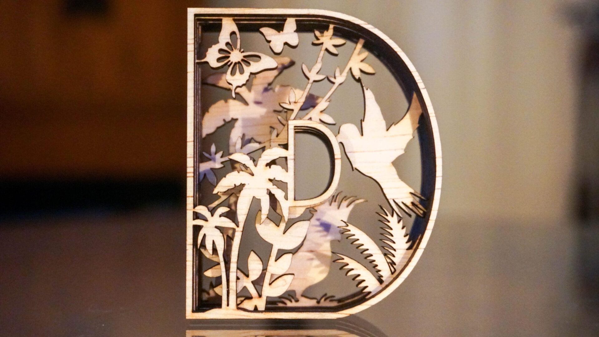 Meerlaagse houten letter D met papegaai, vlinders en tropisch groen. Handgemaakt en levendig met natuurlijke charme.