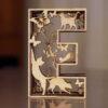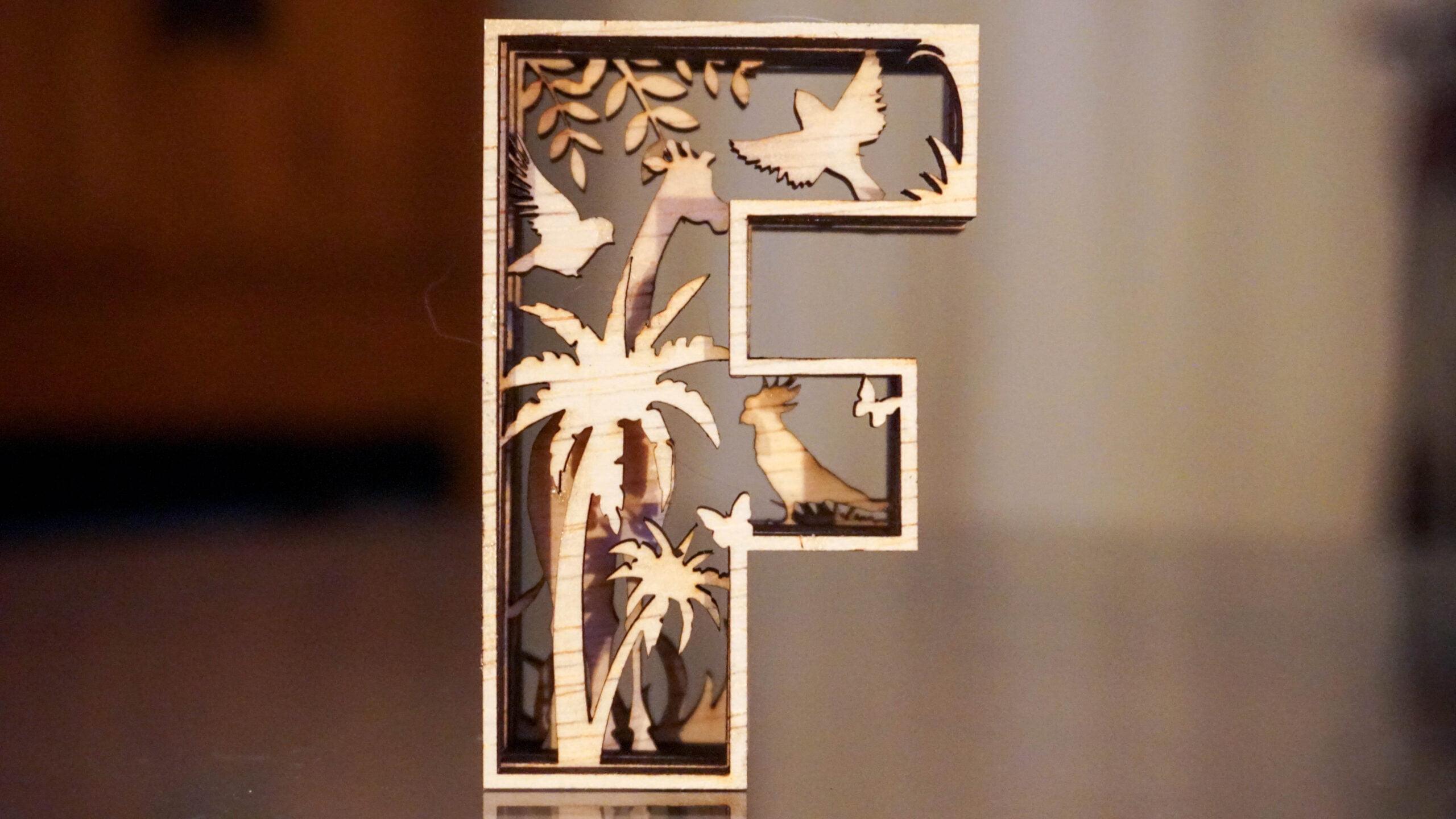 Gelaagde houten letter F met giraf, papegaai en palmbomen. Handgemaakt en zomers – een vrolijk natuuraccent.