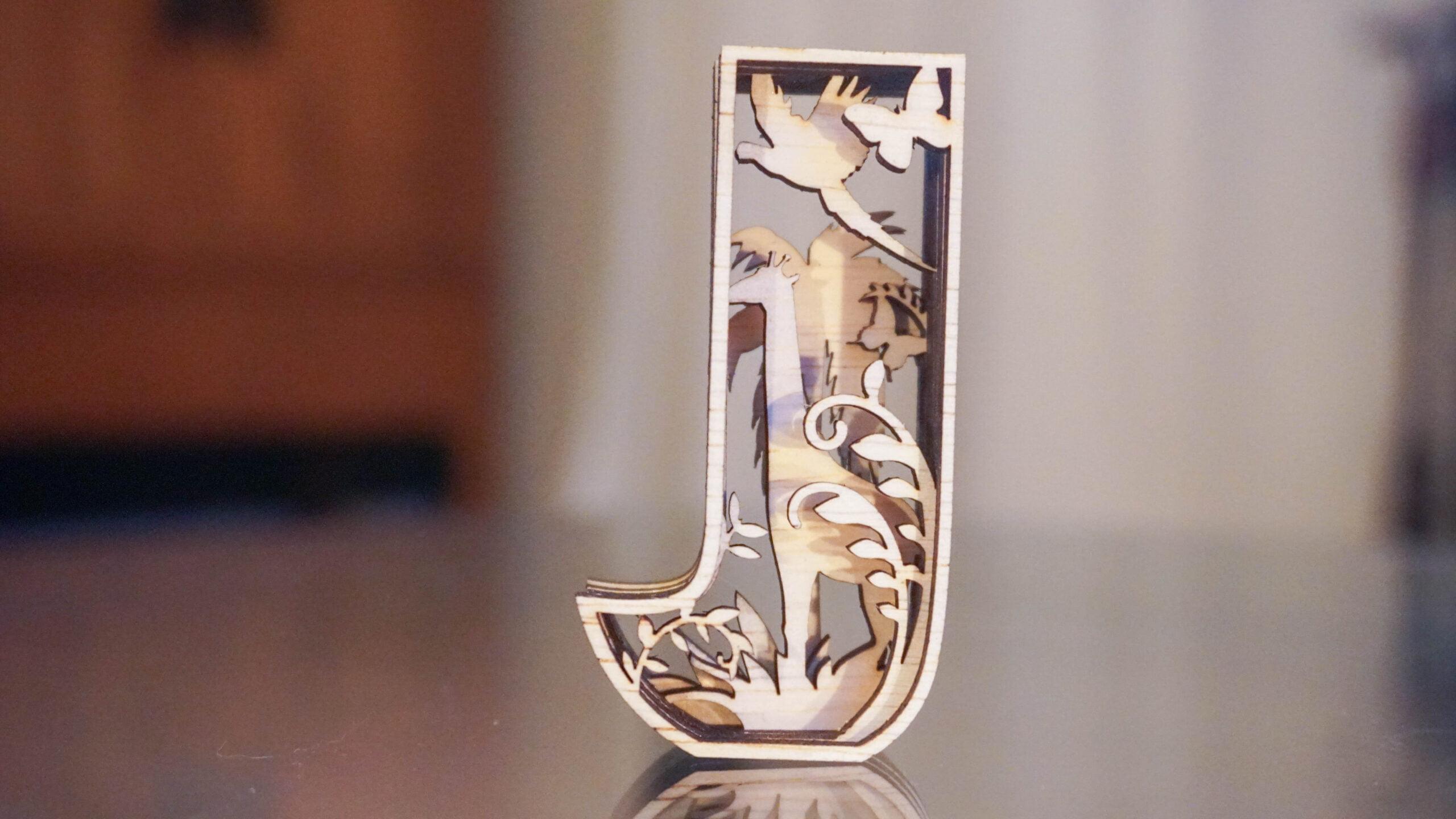 De botanische houten letter J heeft een tropische flair. Centraal zie je een hoge giraf, die rustig onder een palmboom staat. Daarboven zweeft een papegaai, omringd door vlinders die tussen de lagen hout lijken te dansen.