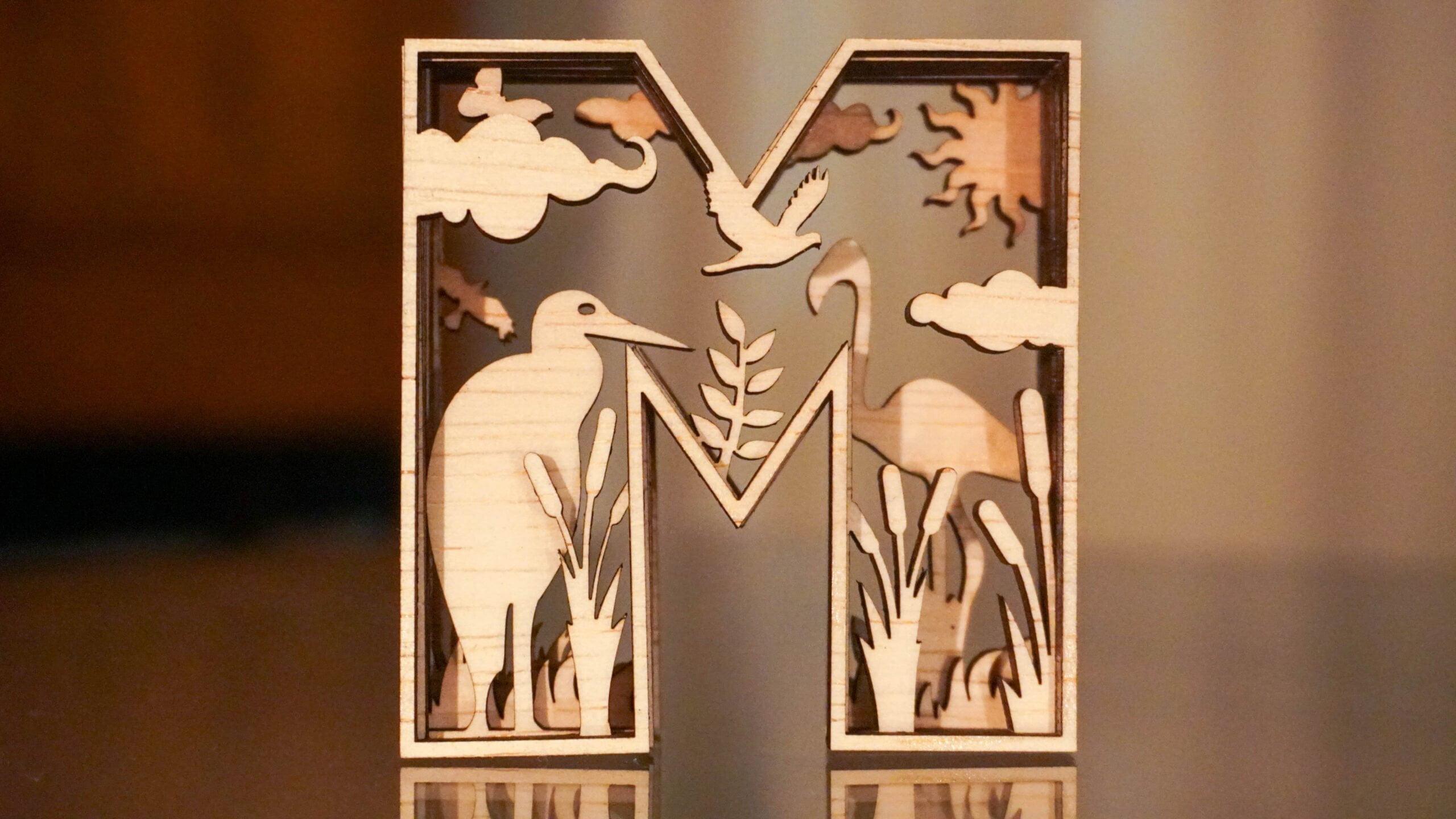 De botanische houten letter M ademt de sfeer van een rustgevend moerasgebied. Aan weerszijden staan twee sierlijke watervogels tussen het riet – de een met een kromme nek, de ander rechtop. Hoog in de lucht vliegt een vogel tussen de wolken, terwijl de zon boven de scène hangt.