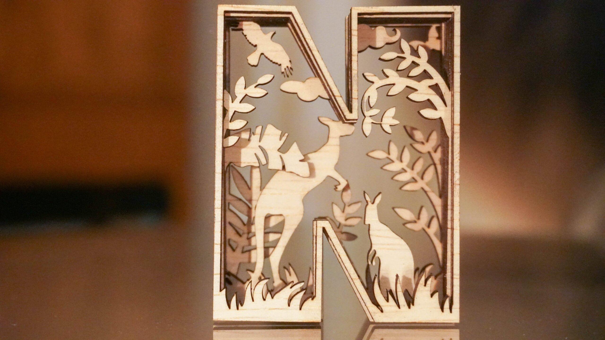De botanische houten letter N brengt een vleugje Australië in huis. Twee kangoeroes – eentje zittend, de ander springend – staan centraal in dit gelaagde ontwerp. Ze worden omringd door bladeren, gras, een vogel in vlucht en zachte wolkjes bovenin.