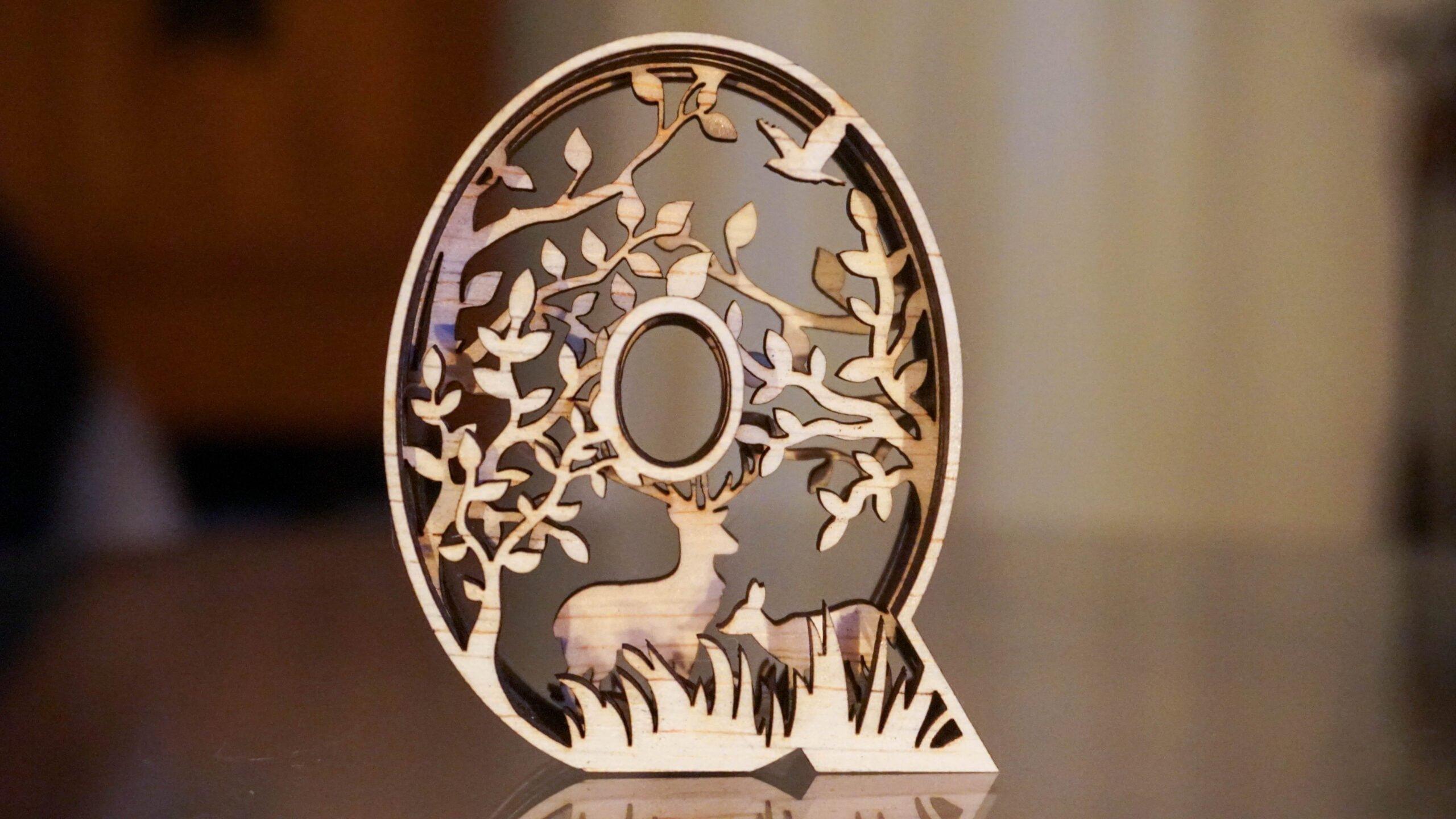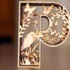 De botanische houten letter Q straalt rust en zachtheid uit. In het midden rusten twee hertjes in het gras – een volwassen hert met gewei en een jong dier naast hem. Boven hen vliegen vogels tussen de takken, alsof je even in een stil stukje bos kijkt.