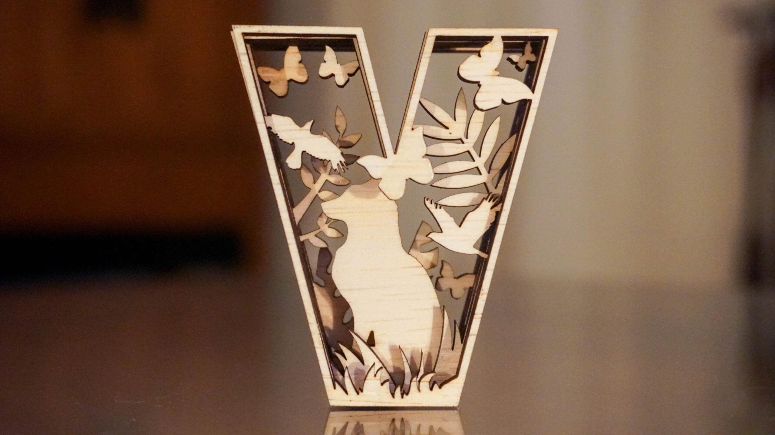 Meerlaagse houten letter V met konijntje en vlinders. Handgemaakt en perfect als botanisch accent of persoonlijk cadeau.