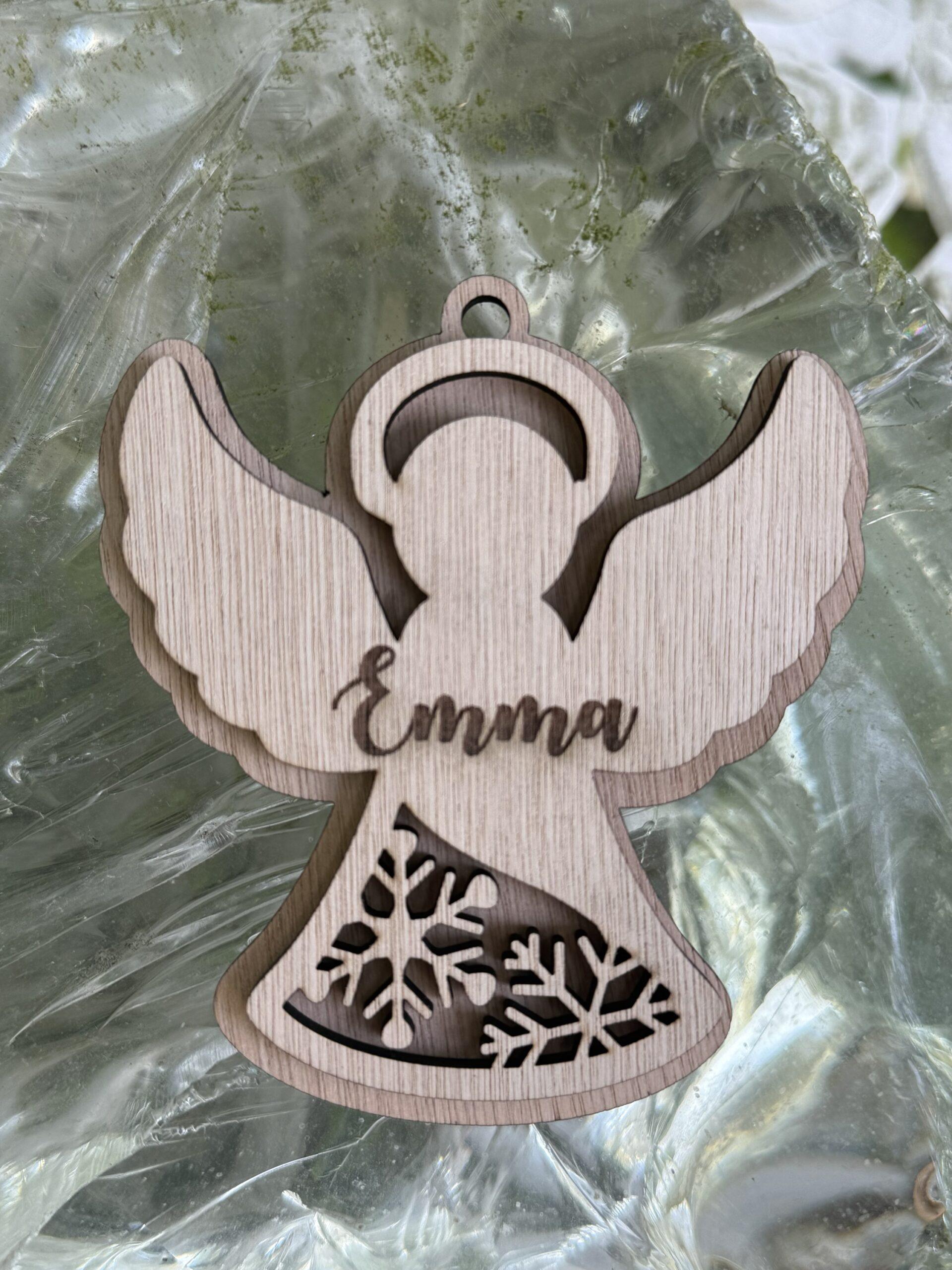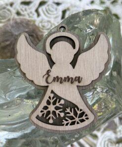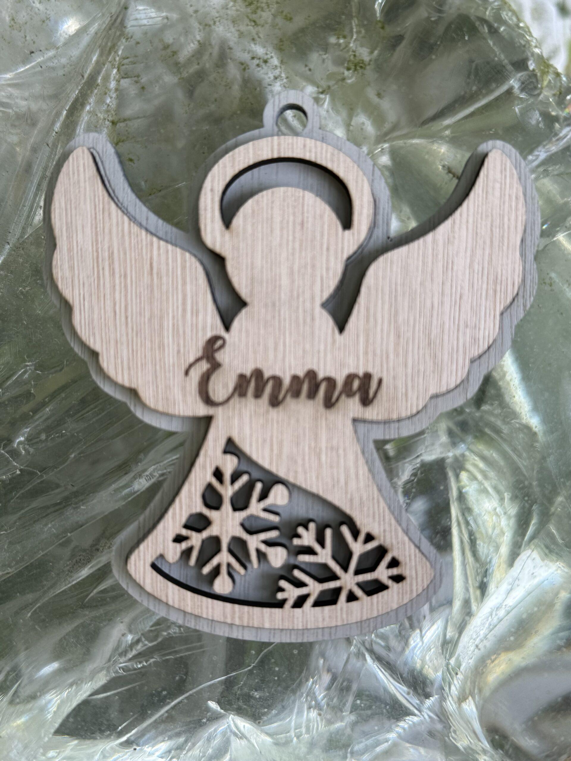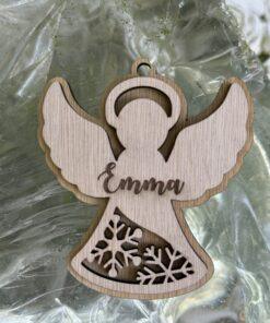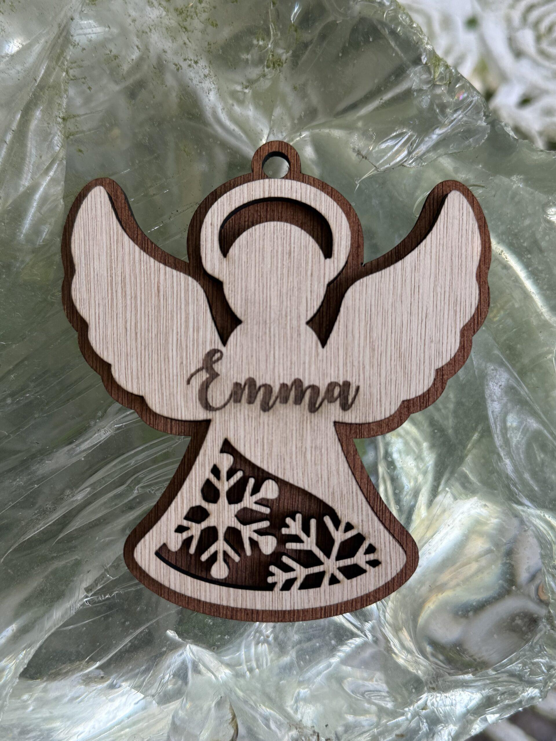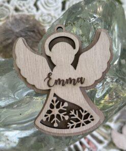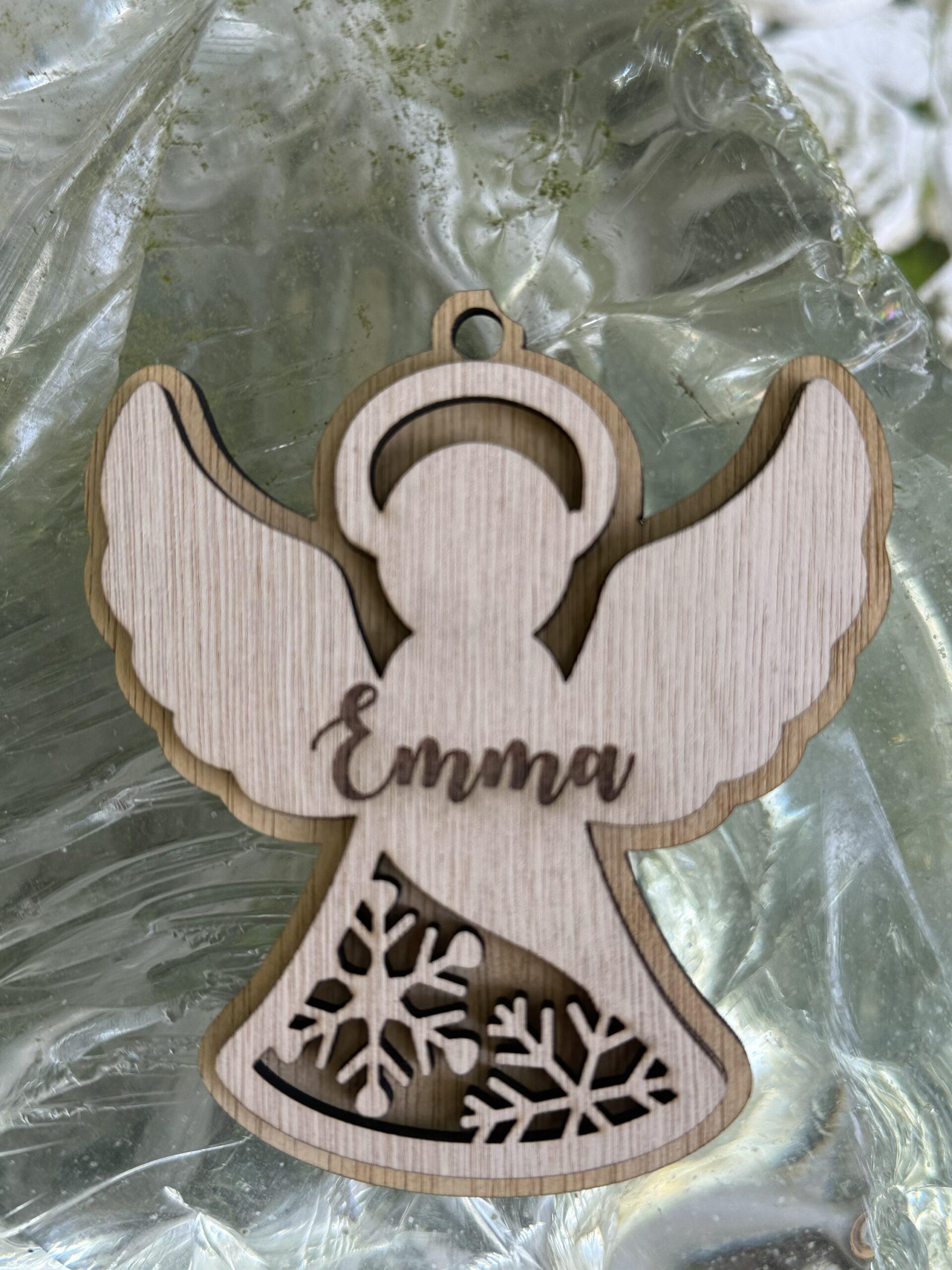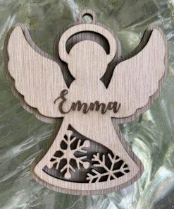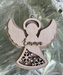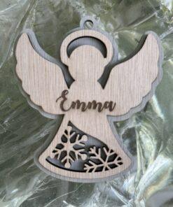 Breng warmte en elegantie in je kerstboom met deze houten kerstengel met uitgesneden rok. Het ontwerp is zorgvuldig gelaserd in twee lagen hout, waardoor een subtiel 3D-effect ontstaat dat prachtig glanst in het licht. De details in de rok maken elk ornament uniek en verfijnd. Perfect als symbolisch cadeau of als persoonlijke toevoeging aan je kerstcollectie.