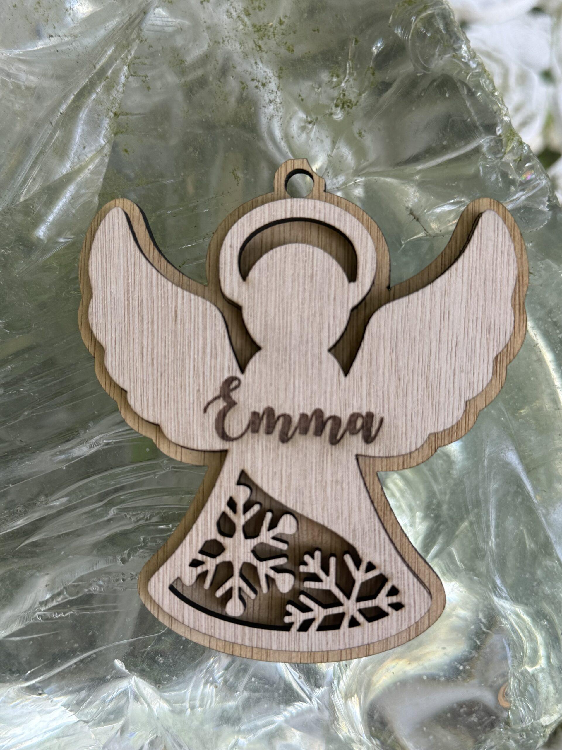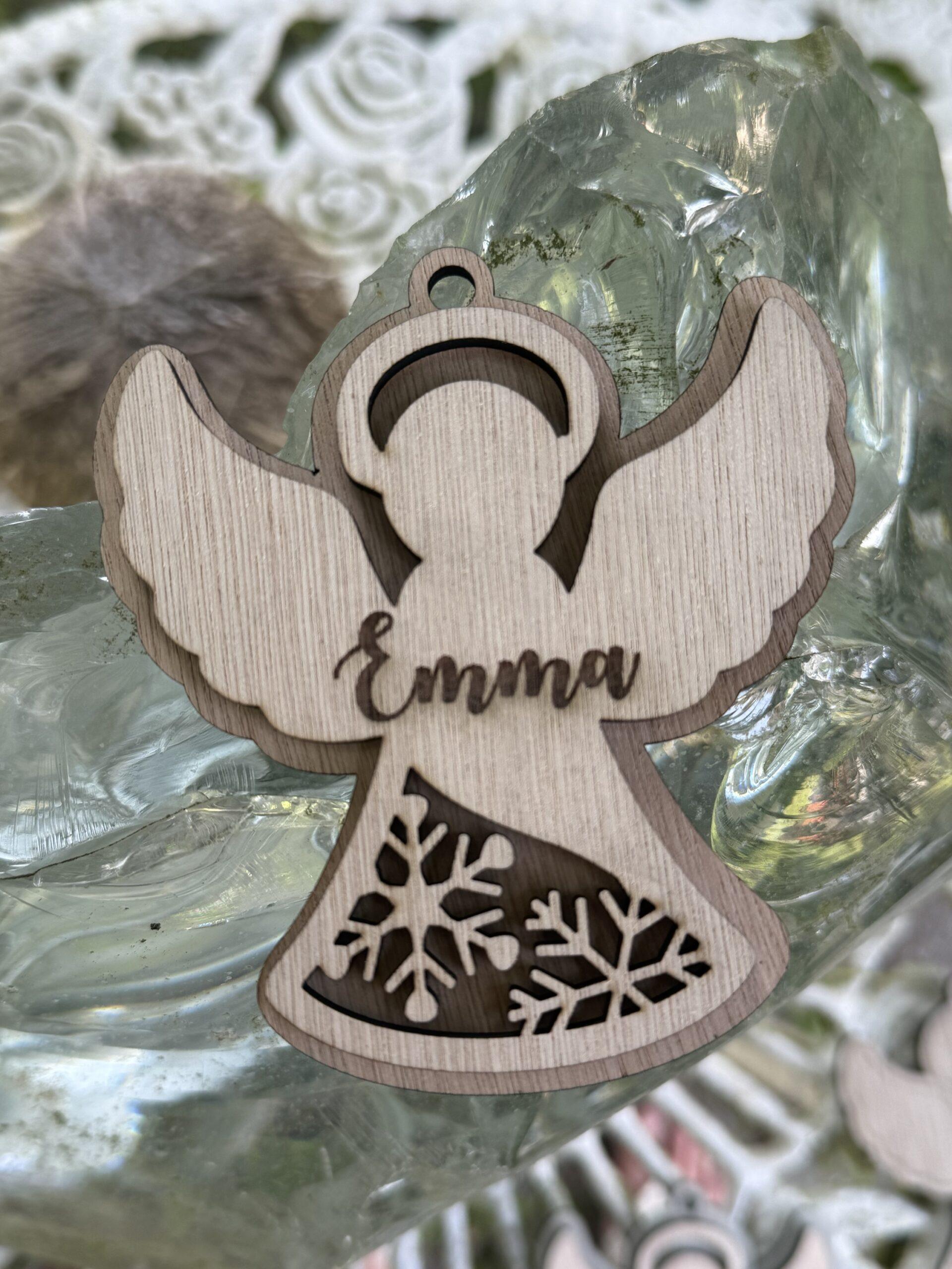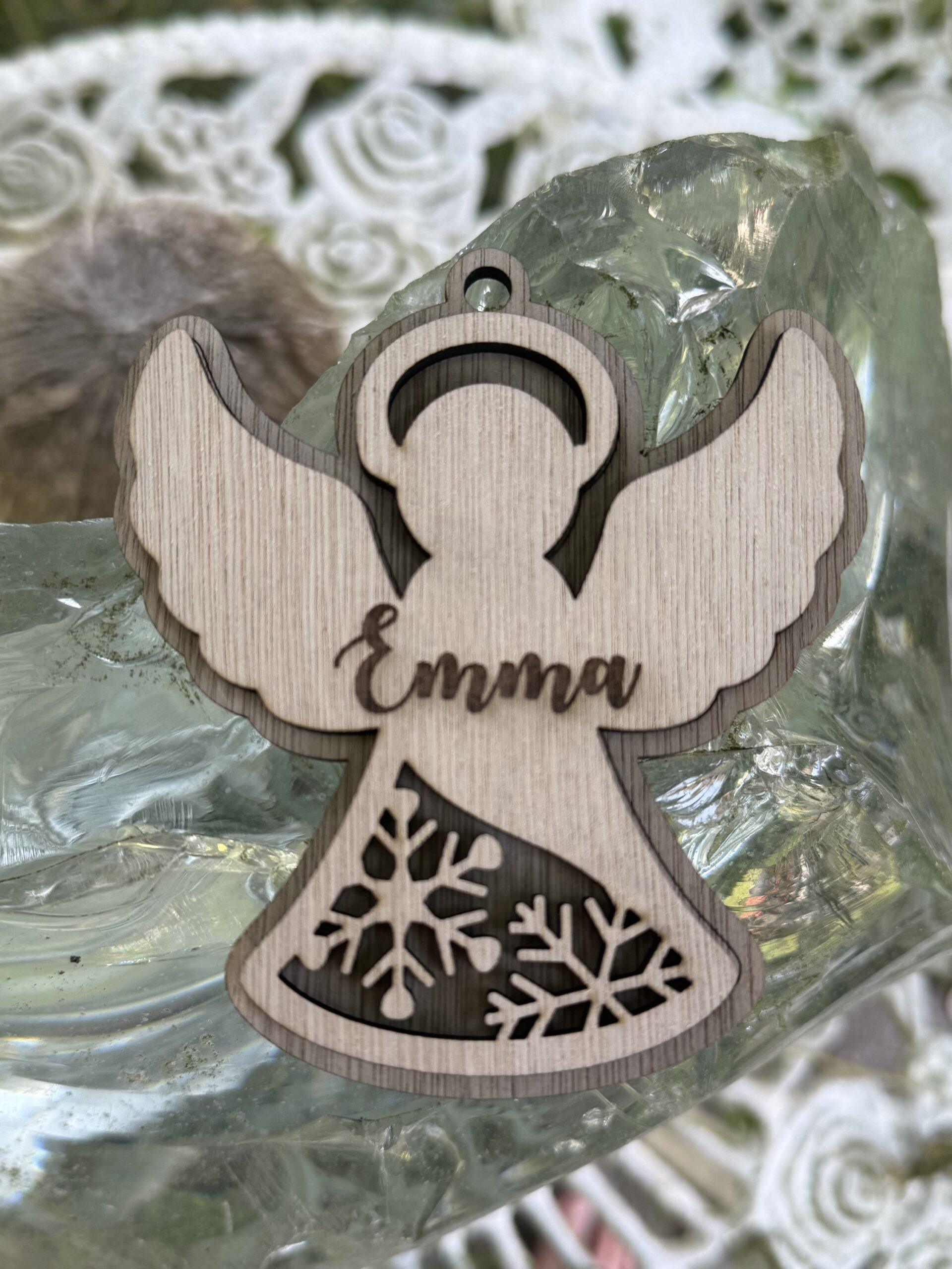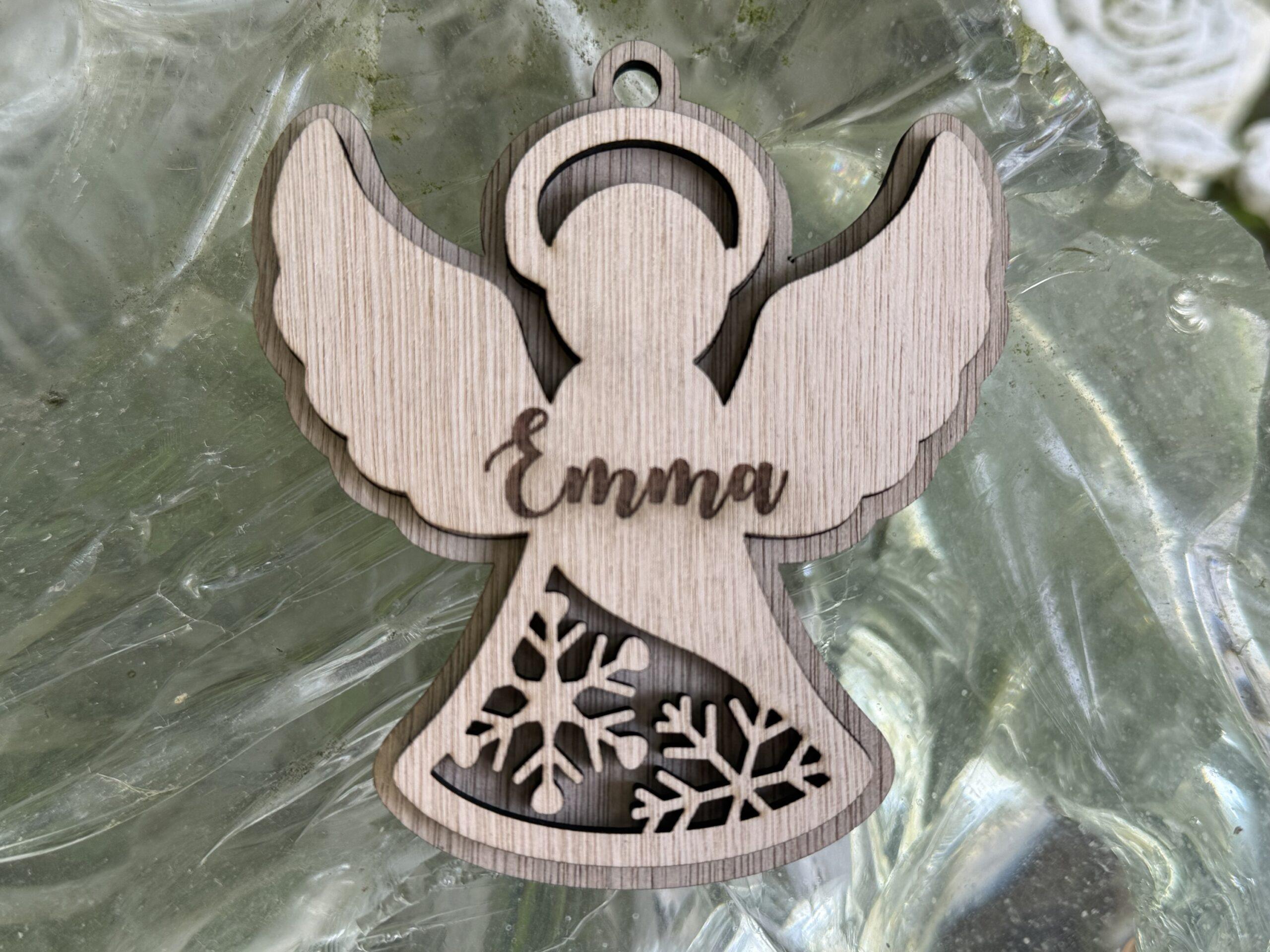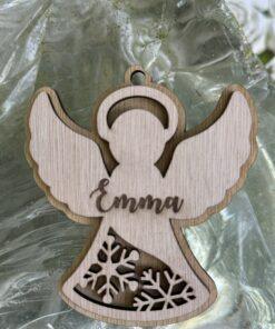 Breng warmte en elegantie in je kerstboom met deze houten kerstengel met uitgesneden rok. Het ontwerp is zorgvuldig gelaserd in twee lagen hout, waardoor een subtiel 3D-effect ontstaat dat prachtig glanst in het licht. De details in de rok maken elk ornament uniek en verfijnd. Perfect als symbolisch cadeau of als persoonlijke toevoeging aan je kerstcollectie.