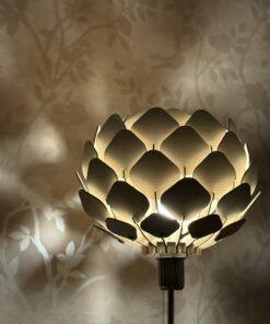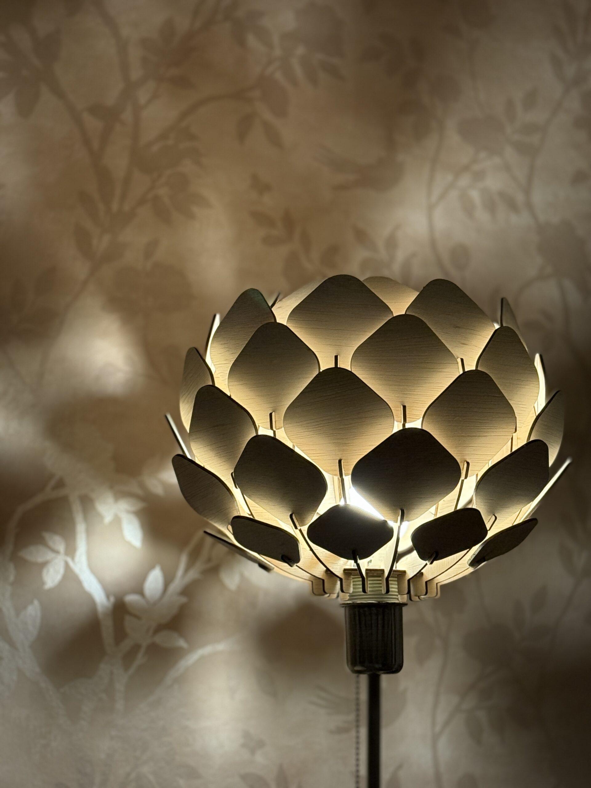 Wanneer je de lamp aandoet, ontstaan er zachte schaduwen die een speels patroon op de muur werpen. Overdag is het al een mooi object, maar ’s avonds komt hij pas echt tot leven. Geen twee lampen zijn identiek – houtnerf en tinten maken elke lamp uniek.