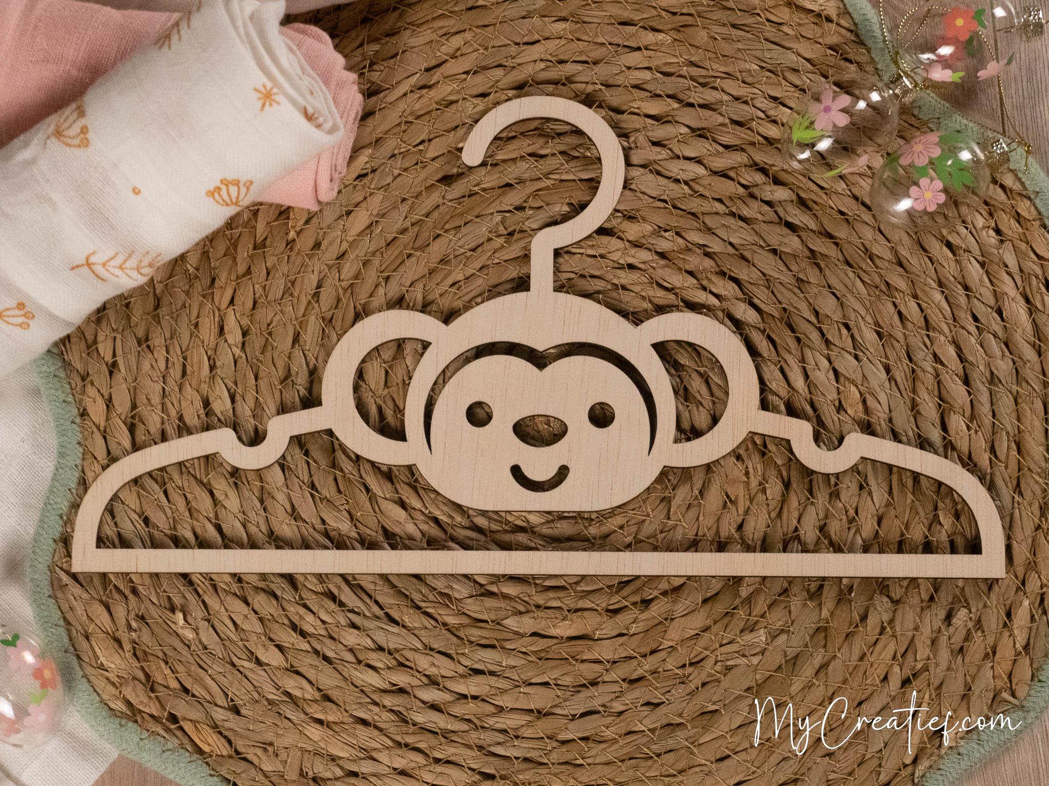 Een houten babykledinghanger met een speels aapje. Licht, stevig en leuk als handgemaakt kraamcadeau.