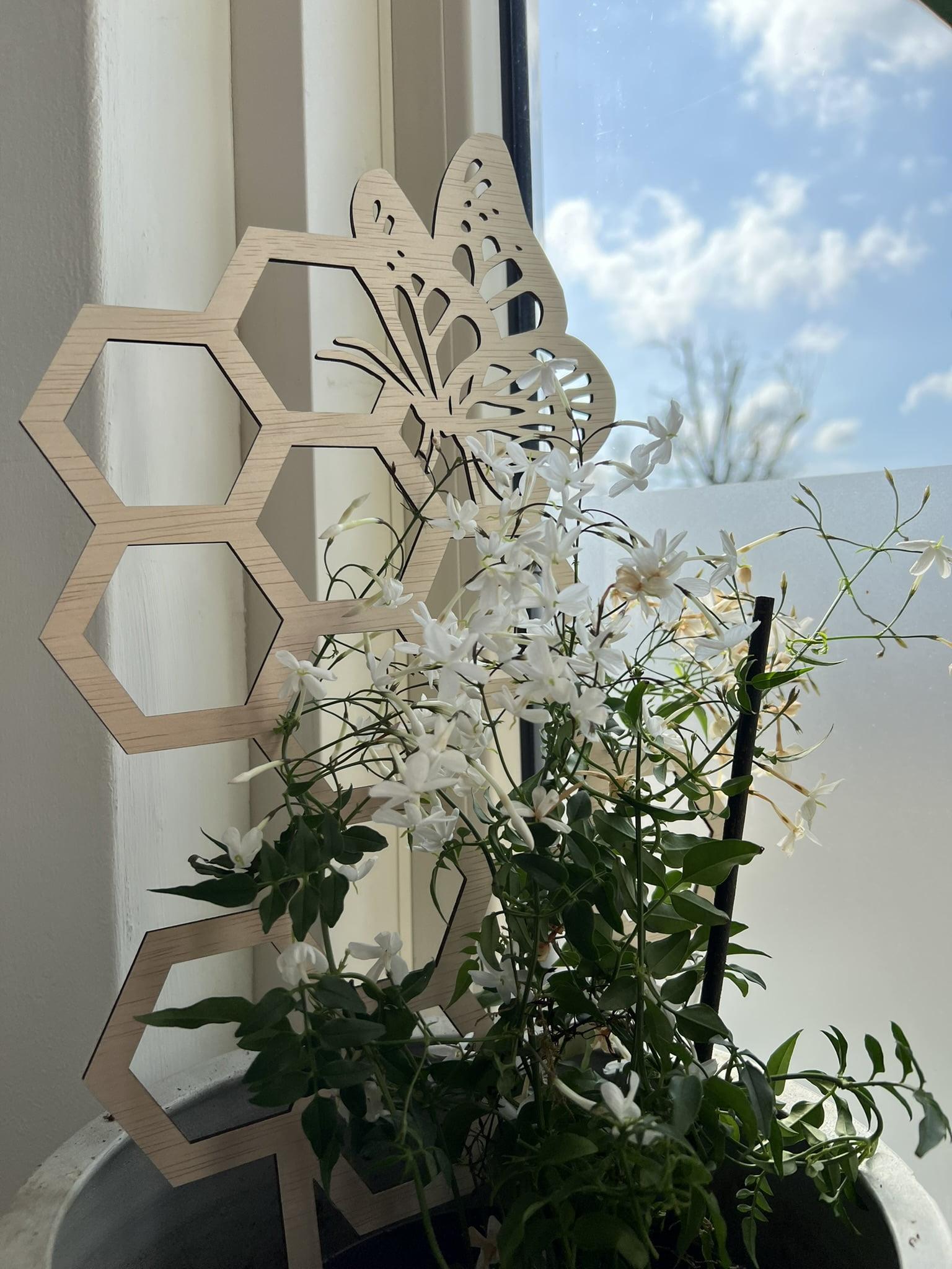 Een houten klimrek hoeft niet saai te zijn – en dit vlindertje bewijst het. Subtiel en sierlijk, met een honingraatstructuur waar je planten zich graag aan vastklampen. Ideaal voor een sierlijke jasmijn of een creatieve touch in je vensterbank.