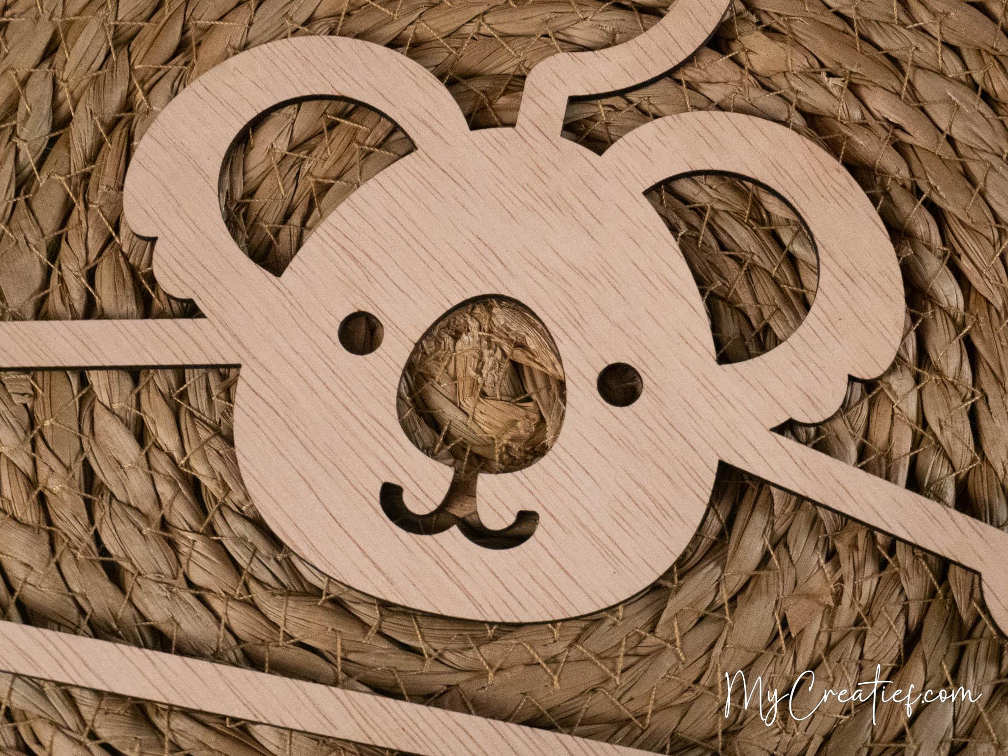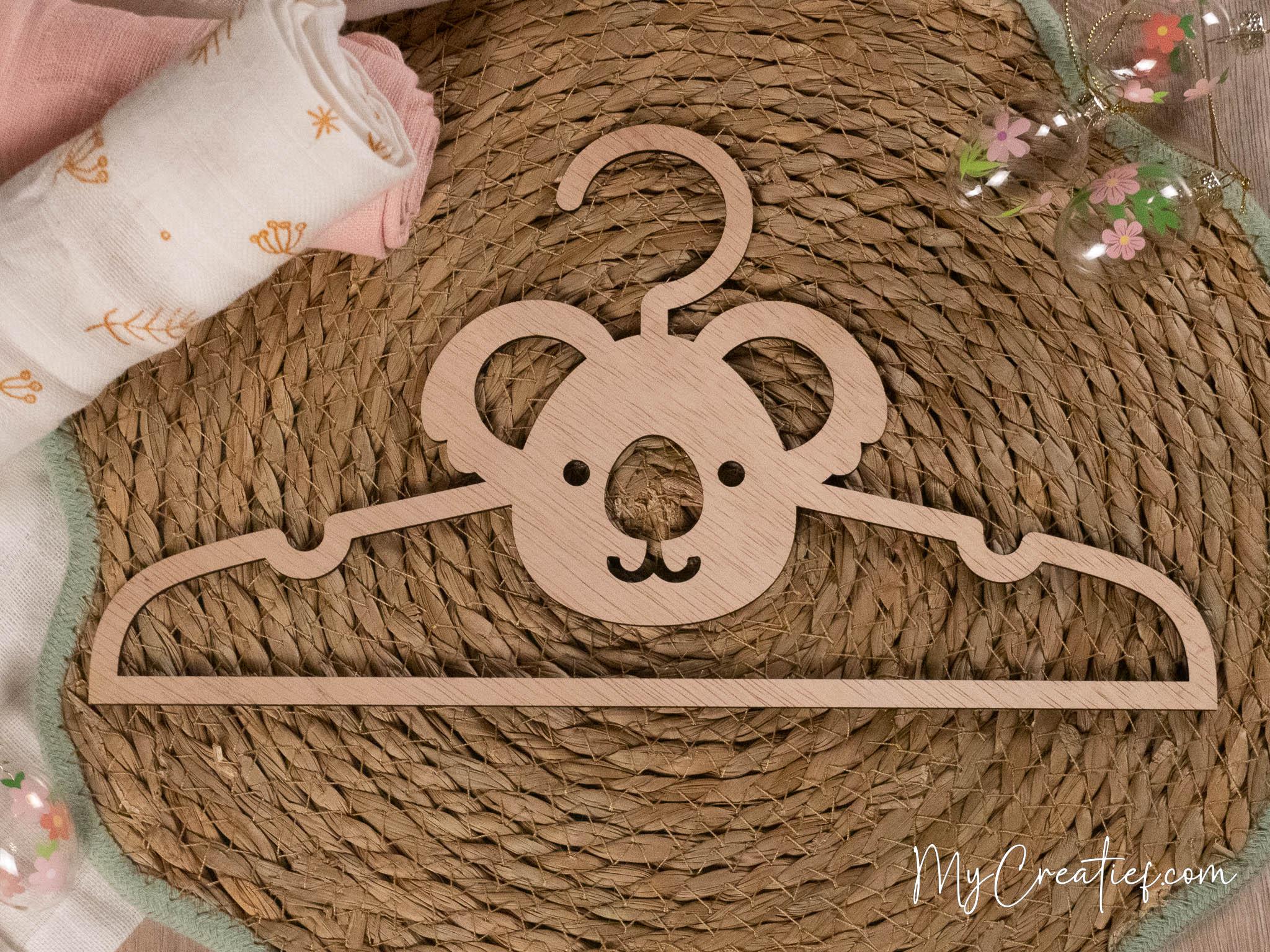 Deze kledinghanger met koalakopje maak ik van 3 mm dik hout. De vorm wordt zorgvuldig uitgesneden met de laser, en daarna werk ik elk stuk met de hand af. Zo voelt het glad aan en ziet het er netjes uit – veilig en fijn om vast te houden of op te hangen.