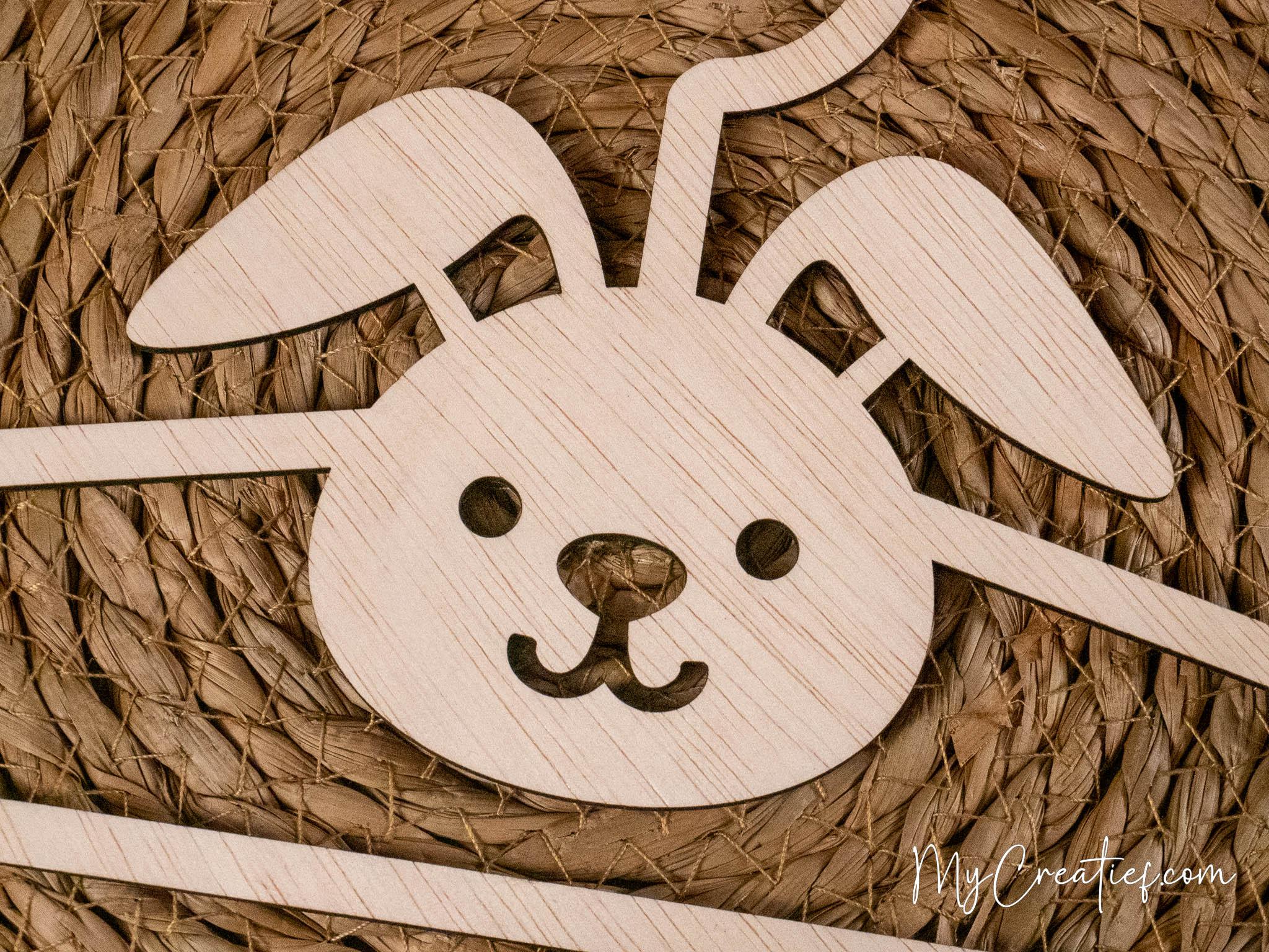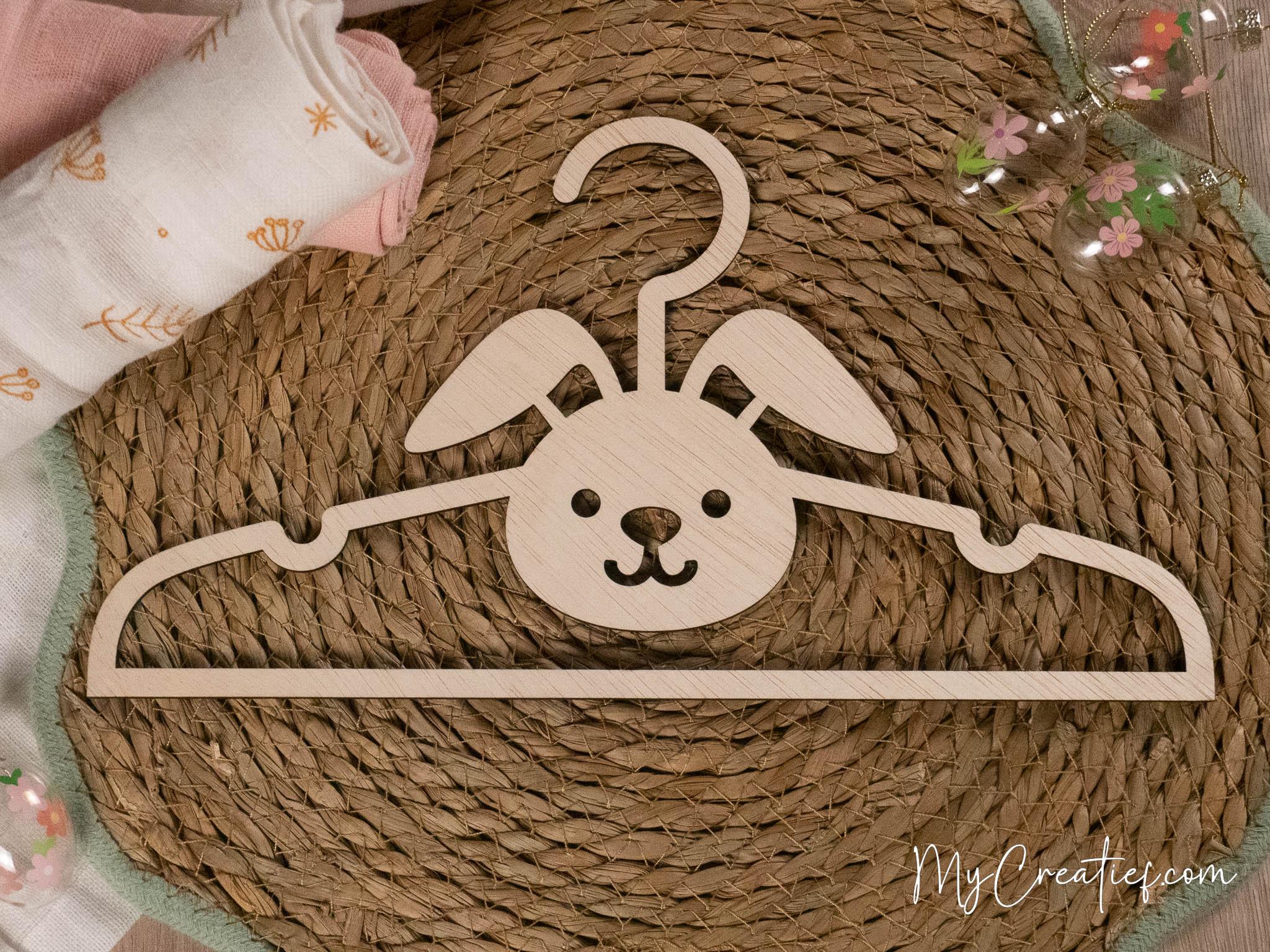 Het ontwerp is eenvoudig en zacht. Je ziet meteen het silhouet van het konijn, met lange oren en een vriendelijk snoetje. Hij is stevig genoeg om een romper, jurkje of jasje aan te hangen, maar ook mooi als decoratie aan een haakje of aan de muur.