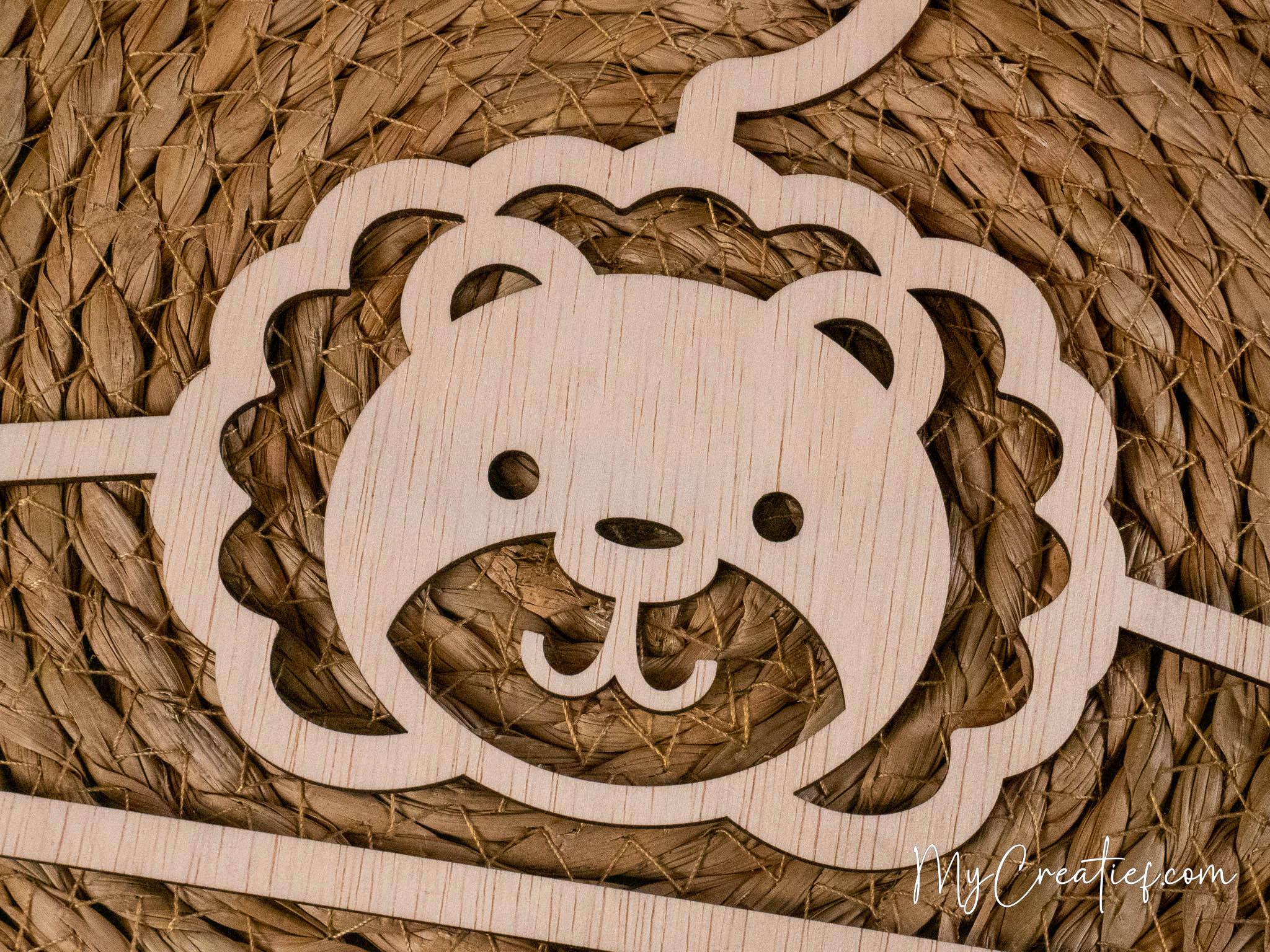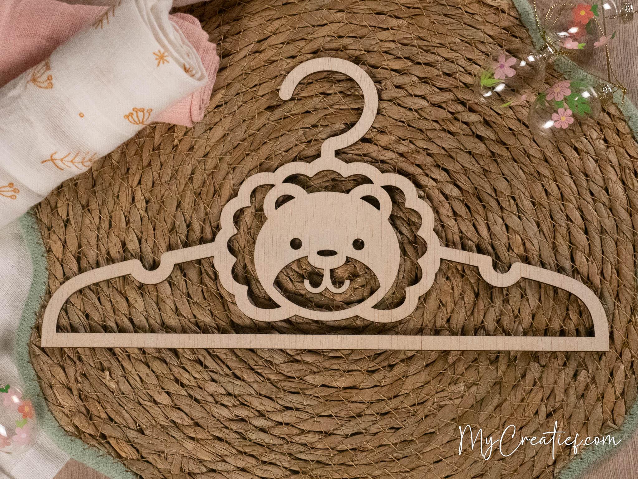 Deze babykledinghanger met leeuwenkop snijd ik uit 3 mm dik hout. De vorm wordt strak uitgesneden met de laser, en daarna werk ik elk stuk handmatig af. Dat kost wat extra tijd, maar zorgt ervoor dat het prettig aanvoelt en netjes oogt.