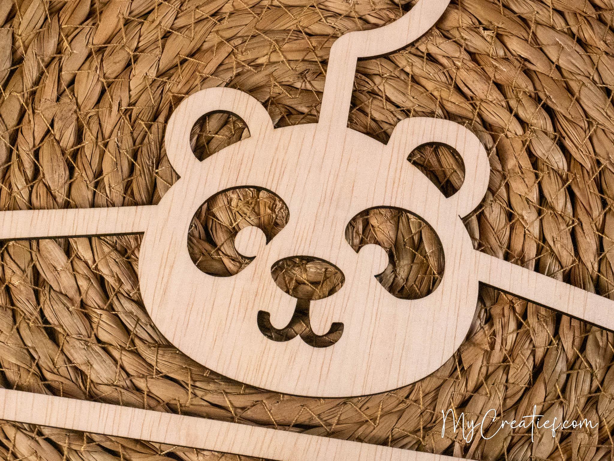 Deze kledinghanger met pandahoofdje maak ik van 3 mm dik hout. De vorm snijd ik met de laser uit, maar de afwerking gebeurt altijd met de hand. Zo voelt elk stuk prettig aan, zonder scherpe randjes, en blijft het mooi in vorm.