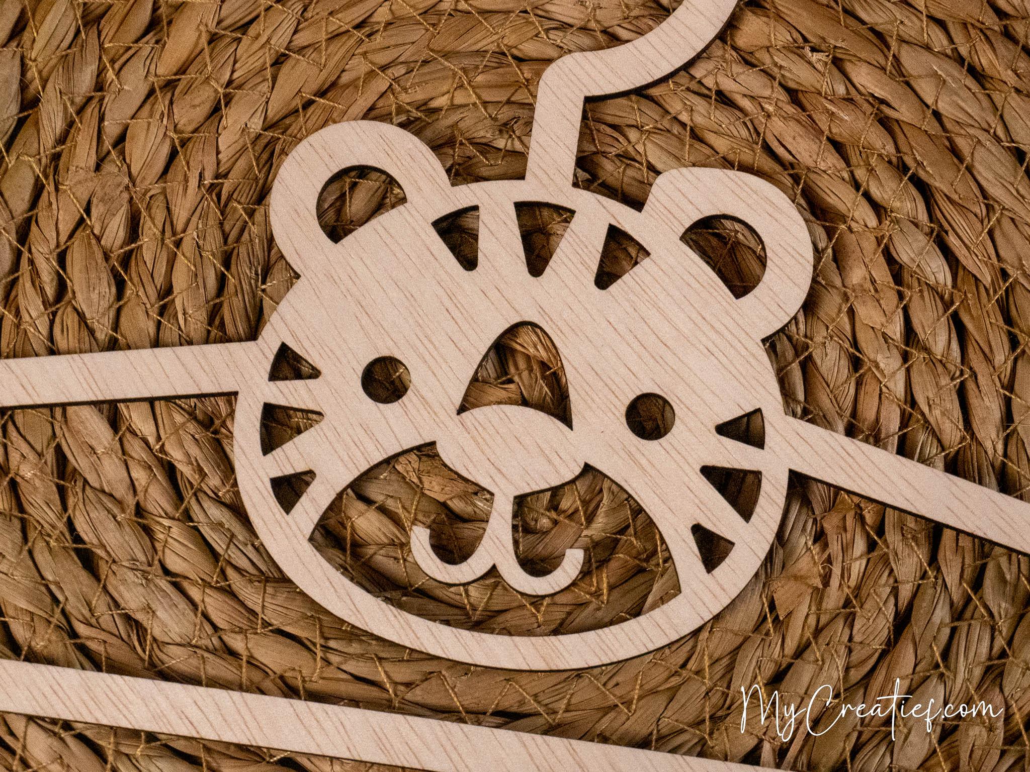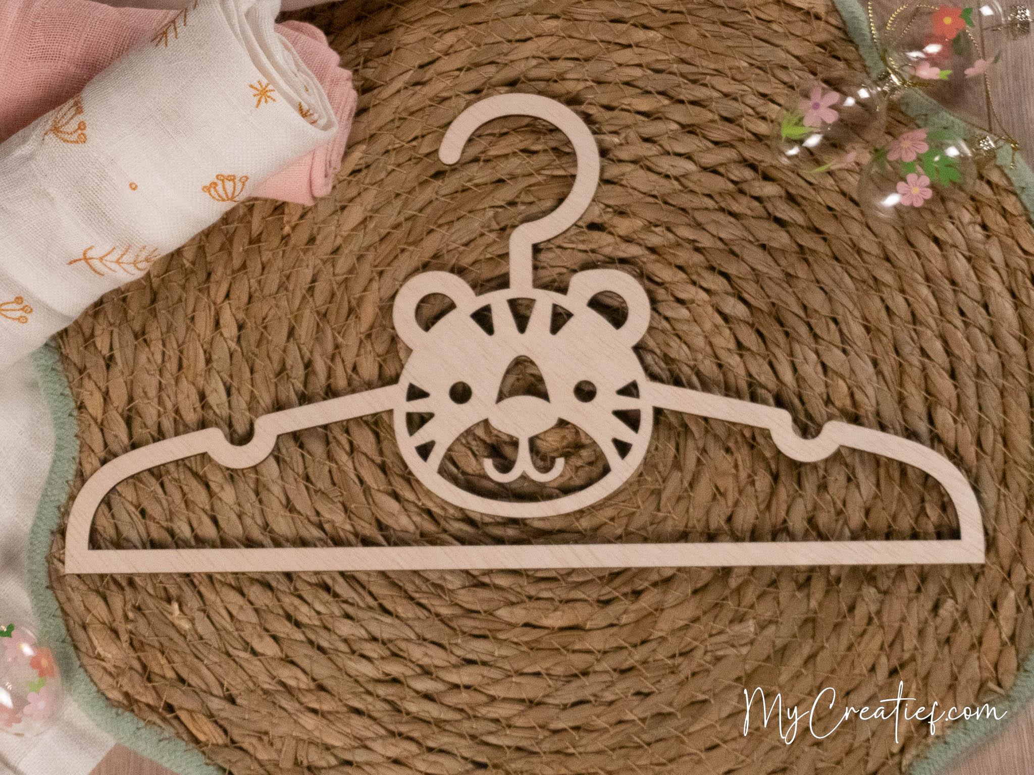 Deze kledinghanger heeft een tijgerkopje als silhouet – stoer, maar met een zachte uitstraling. Ik maak ‘m van 3 mm dik hout, snijd de vorm met de laser, en werk alles met de hand af. Zo zorg ik ervoor dat de randen glad zijn en elk stuk prettig aanvoelt.