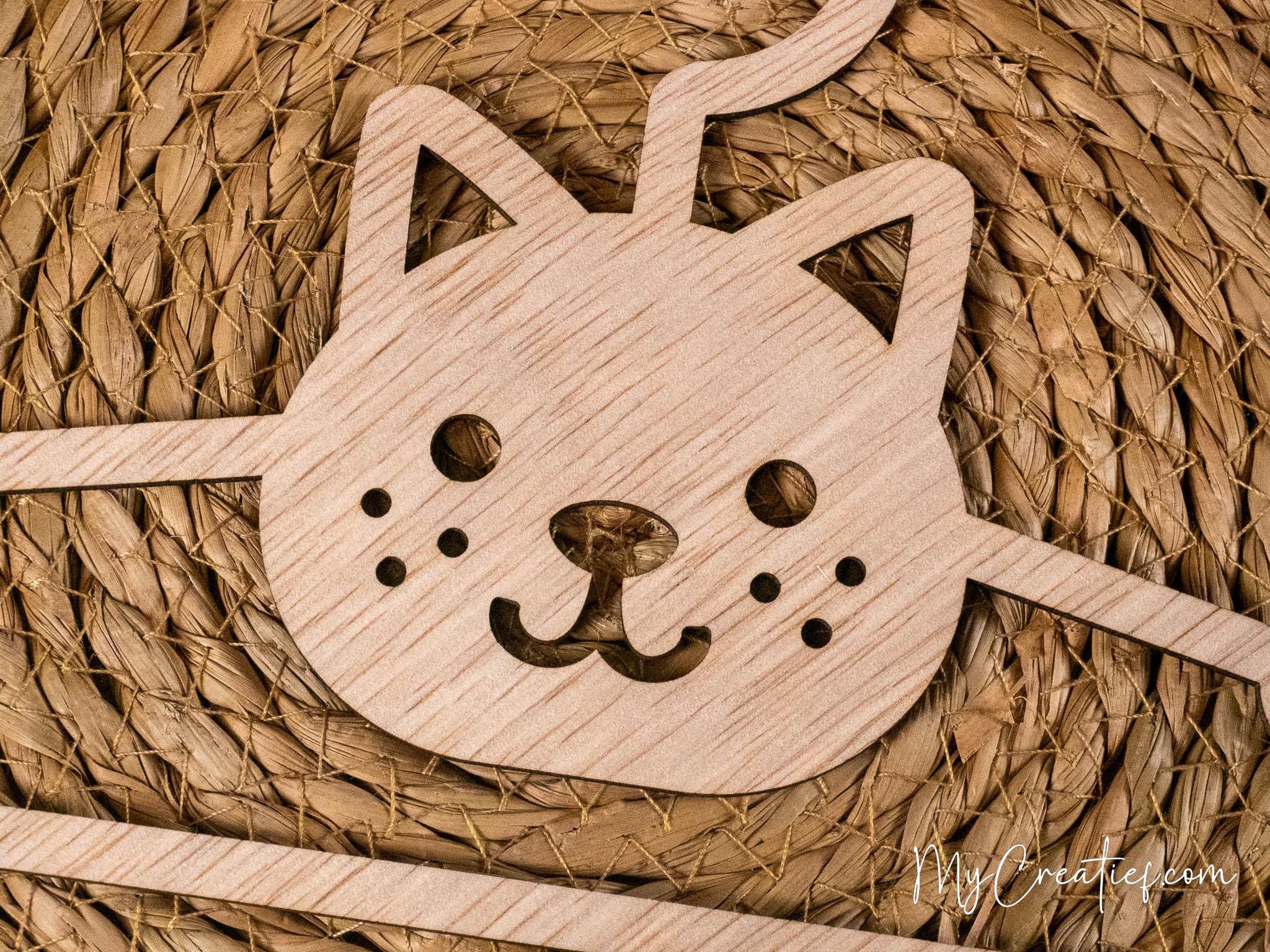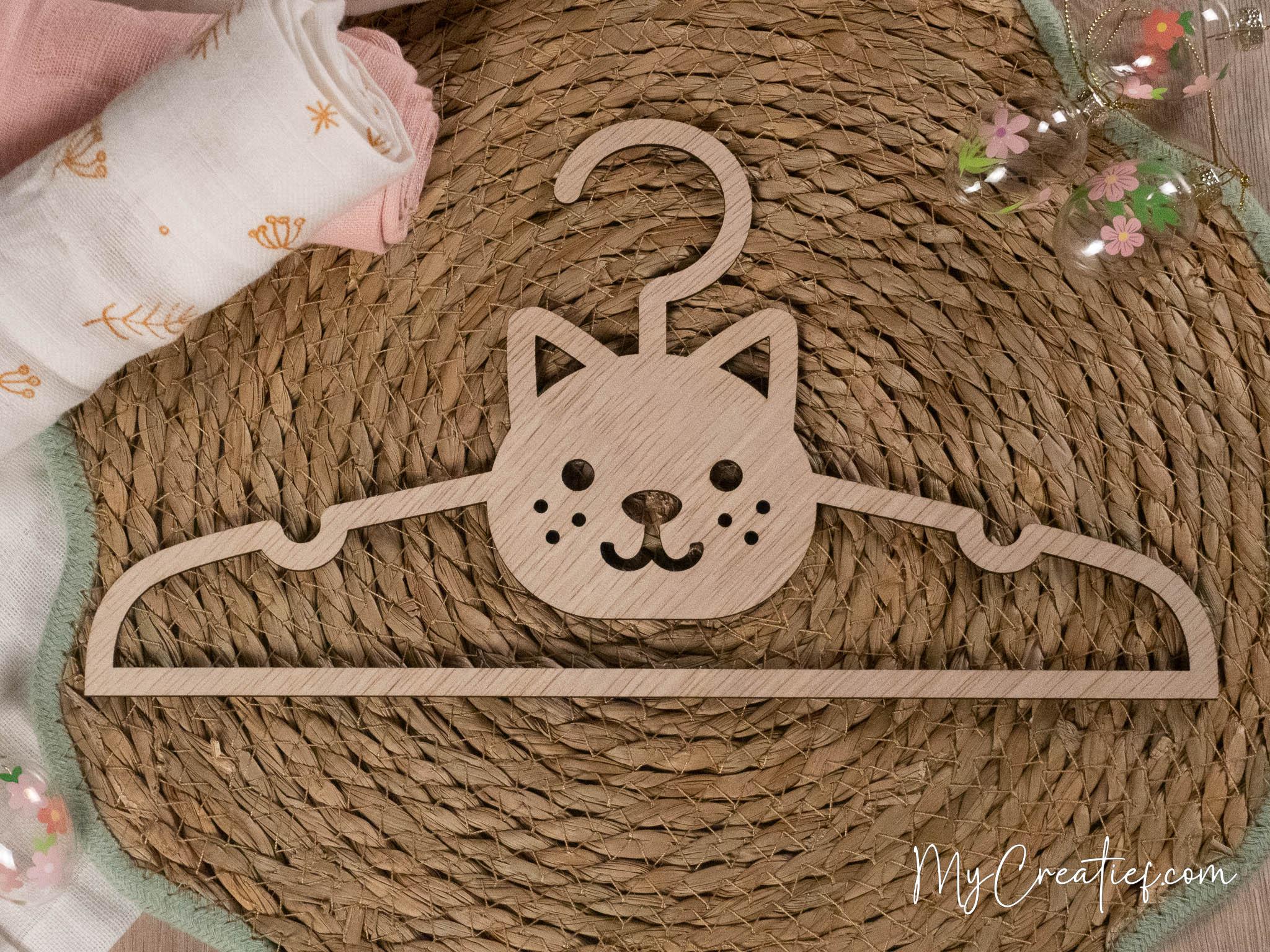 Deze babykledinghanger met een kattenkopje maak ik van 3 mm dik hout. De vorm snijd ik met de laser uit, maar daarna werk ik hem altijd met de hand af. Zo zorg ik ervoor dat hij fijn aanvoelt en de details netjes zijn.